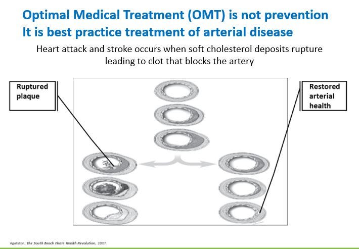 Sur le côté droit, vous voyez les résultats du traitement médical optimal (OMT). Le dépôt de cholestérol se stabilise, devient moins enflammé et il est beaucoup moins susceptible de se rompre et de provoquer un caillot entraînant une crise cardiaque. Ces changements vous offrent plus de protection en quelques jours. Comme vous pouvez le voir, ces dépôts mous et dangereux peuvent être réduits avec un traitement médical et l’artère devient plus normale. Notre compréhension de la maladie des artères cardiaques est bien meilleure maintenant et il existe des traitements très ciblés et précis pour vous protéger. Cette image provient de The South Beach Heart Health Revolution et je l’ai utilisée avec la permission du Dr Agatston.